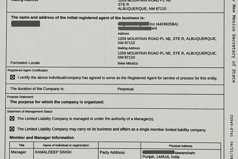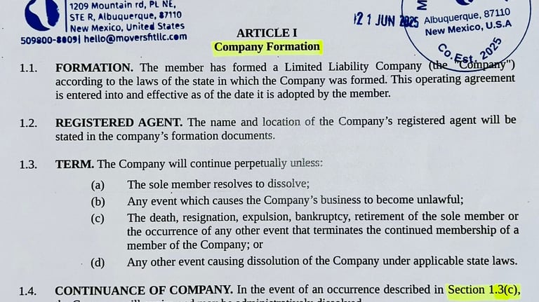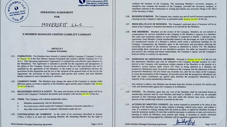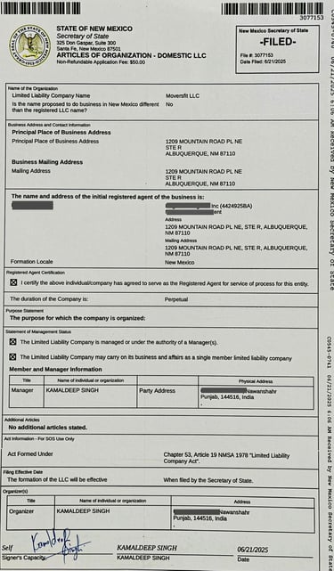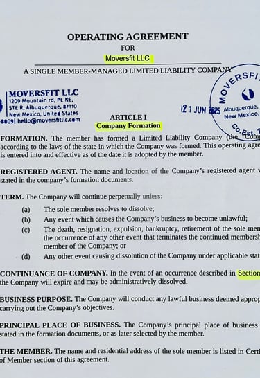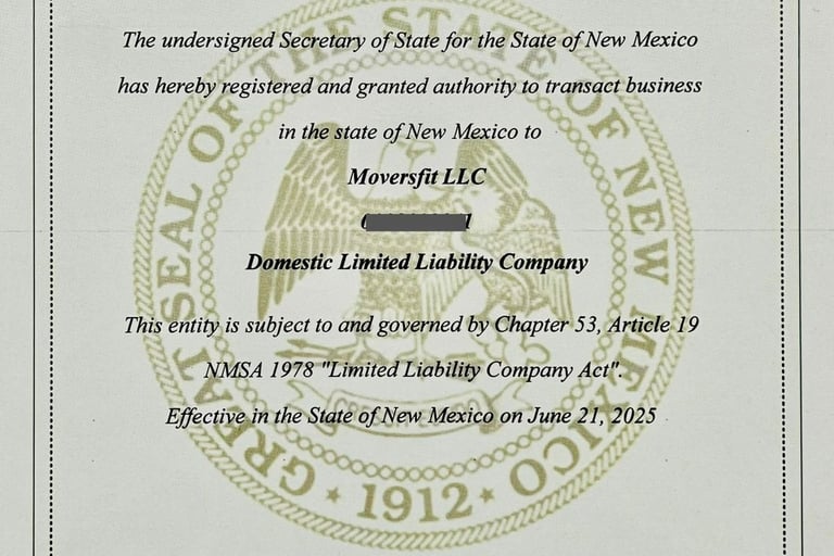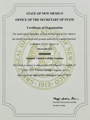 Official document of Moversfit LLC’s legal registration in the State of New Mexico, USA.