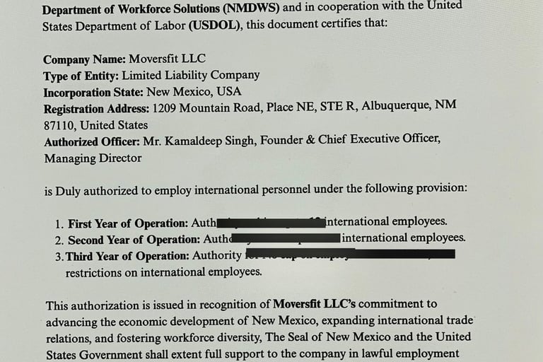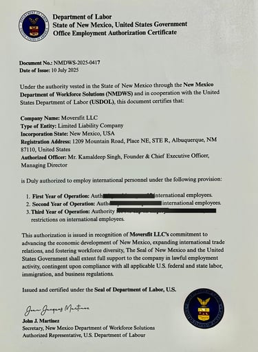 This document confirms Moversfit LLC’s compliance with labor regulations and employment standards under the New Mexico Department of Labor.
