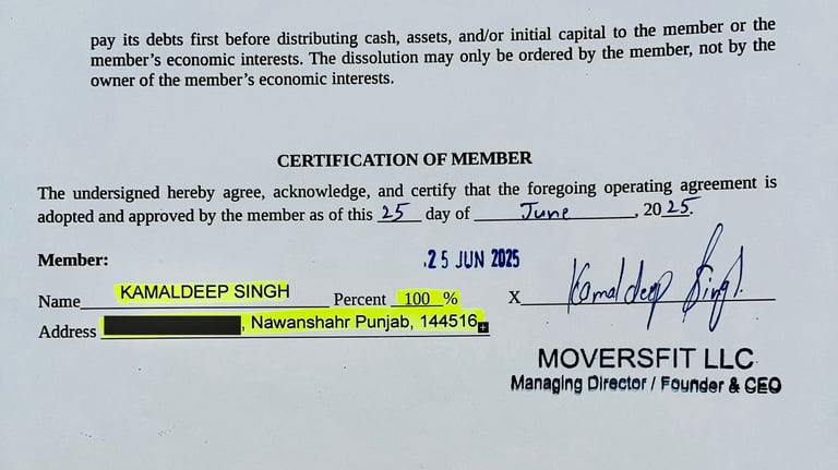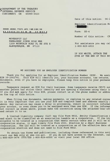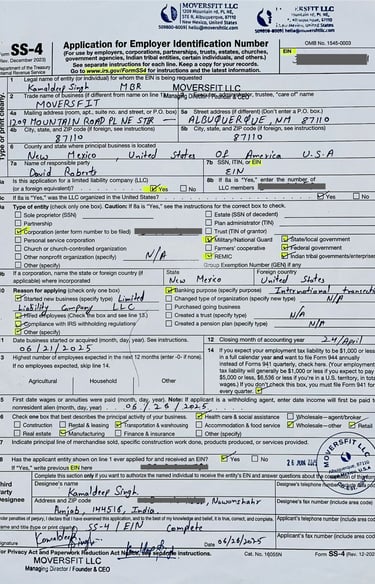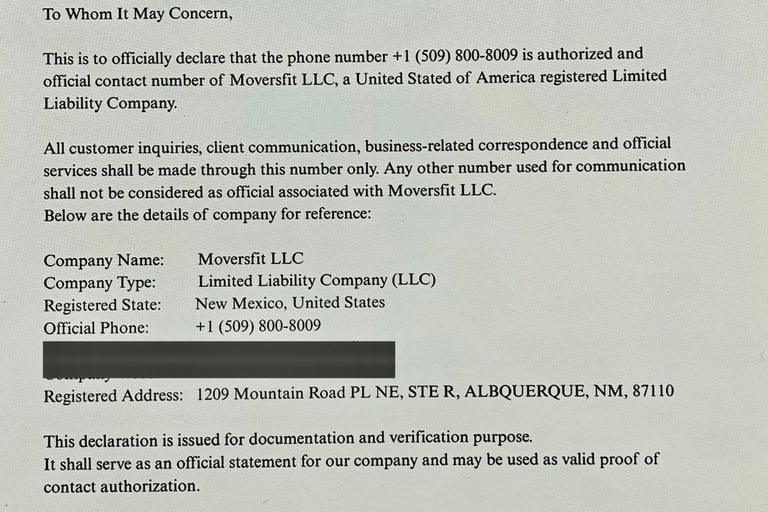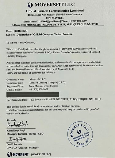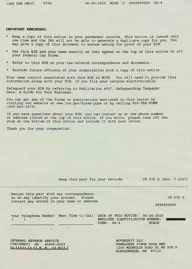 The company is officially registered with the Secretary of State, New Mexico (USA) and operates under a valid Employer Identification Number (EIN) issued by the U.S. Internal Revenue Service (IRS). Moversfit LLC has also completed its BOIR filing with FinCEN, ensuring full transparency under U.S. corporate regulations.