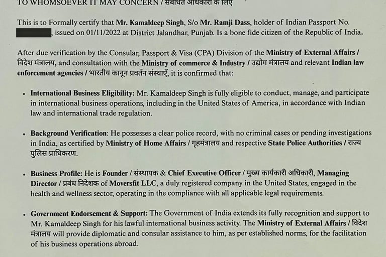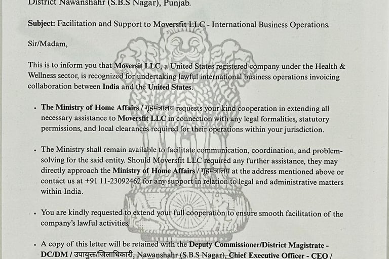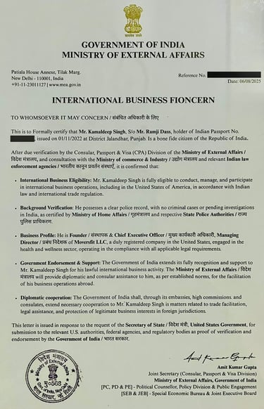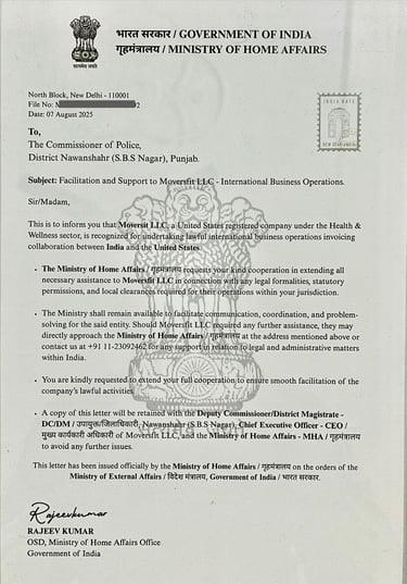 To support global medical operations, the company holds a legally issued medical business license, authorizing healthcare distribution and clinical equipment supply across multiple countries. Moversfit LLC is also approved by the Ministry of External Affairs (MEA) and the Ministry of Home Affairs (MHA), Government of India, enabling international trade, export operations, and cross-border healthcare services.
