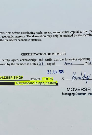 Official certificate confirming the legal formation and establishment of Moversfit LLC.